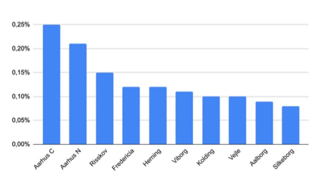 Hvis vi tager et kig på Jylland, så indtager Aarhus C førstepladsen, som den by, der har købt mest internet pr. indbygger i 2022. Vi skal helt ned til 4. pladsen, for at møde en by, der ikke er en del af Aarhus Kommune. Herefter kommer Herning, Viborg, Kolding, Vejle, Aalborg og på en tiende plads, Silkeborg.