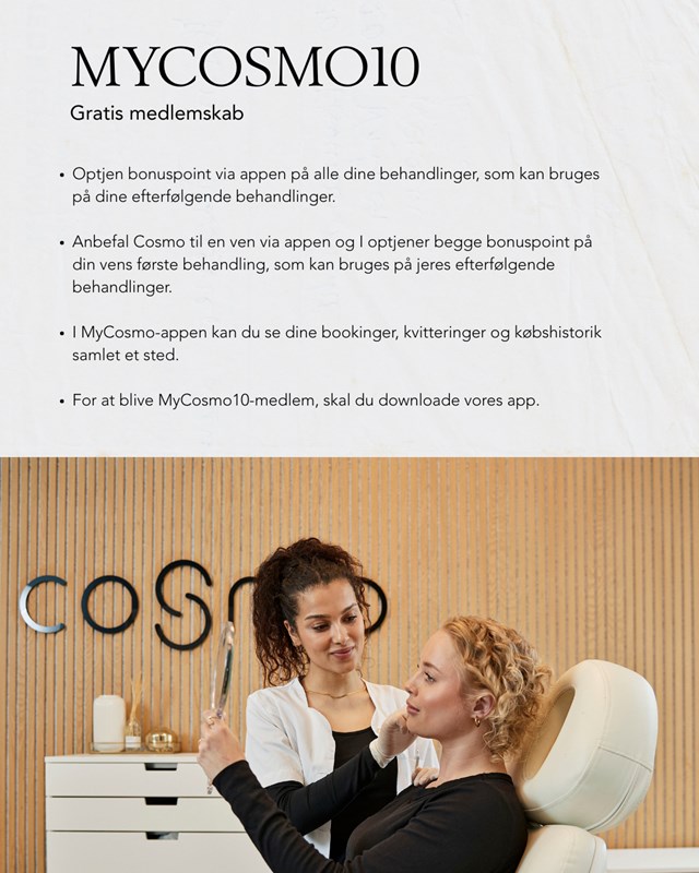 MyCosmo10 er gratis og giver adgang til en række digitale og økonomiske fordele gennem klinikkens app. Her kan medlemmer optjene bonuspoint på alle behandlinger svarende til 10 procent rabat, som kan bruges på efterfølgende behandlinger. Derudover kan kunder anbefale Cosmo Laser til en ven gennem appen, så begge optjener bonuspoint på vennens første behandling.