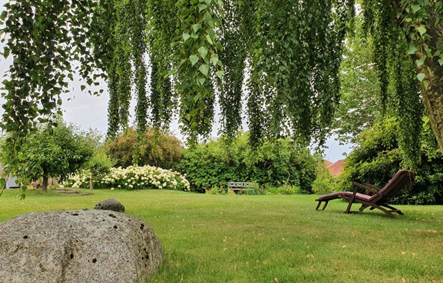 “Her kan vi lave øvelser og meditere og kursisterne kan opholde sig her i pauserne og nyde roen og havens skønhed. Mange oplever, at det være i naturen eller i smukke udendørs omgivelser er en støtte til at geare ned indvendigt og opleve ro. Så det er absolut et ekstra gode at have adgang til smukke udendørs omgivelser.”
