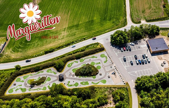 Ved minigolfbanen er der gratis parkering og en legeplads til de små. Her er caféborde hvorfra der tilbydes tallerkenretter, is, pølser, øl, vand og burger. (Foto: Margueritten Café & Grill)