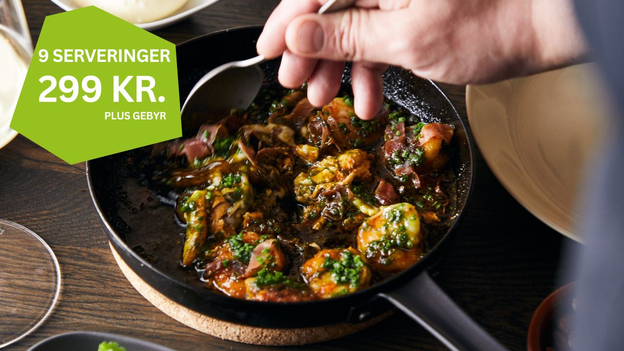 En aften med spansk inspireret tapasMenuen starter med en række lækre snacks, herunder surdejsbrød med jomfruolivenolie, Socios' marinerede Nocellara oliven og ristede, saltede mandler.