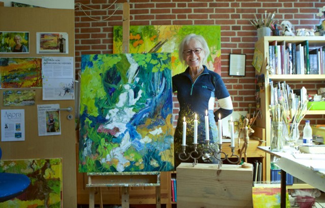 "Ja, hvor der end er skønt og ikke mindst stilhed. Så fordyber jeg mig totalt i maleriets verden og elsker at tage imod alt det, der findes inde i mig og udtrykke det i malerier, jeg selv sommetider er målløs over," fortæller hun.